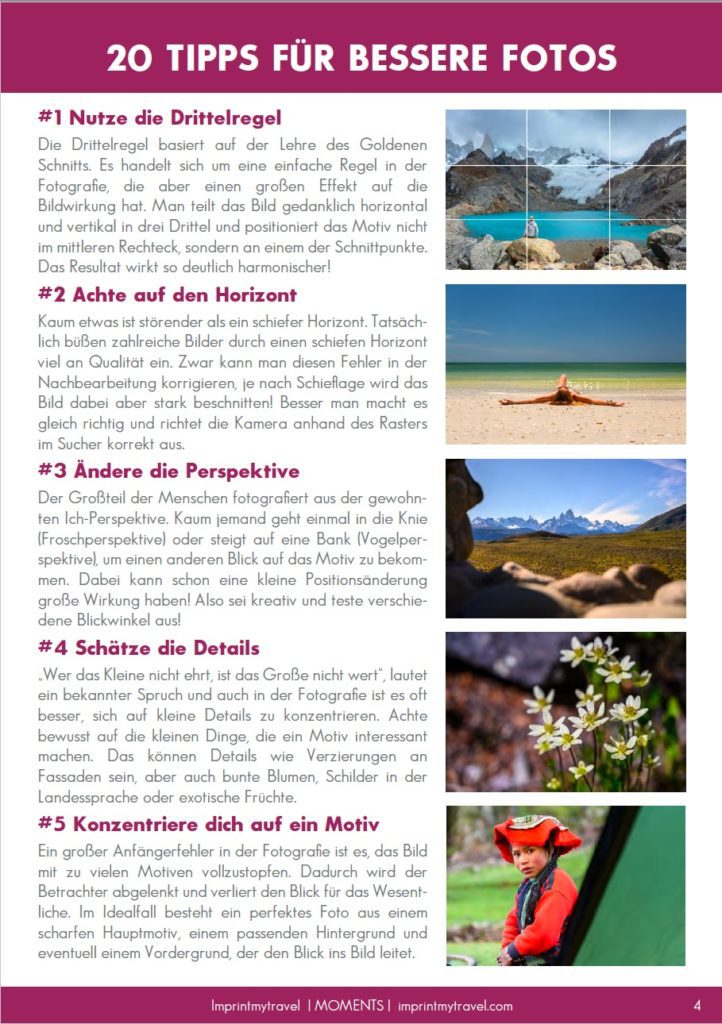 In meinem E-Book zeige ich dir 100 Reiseaufnahmen zu verschiedensten Themen, um dir ein Gefühl zu vermitteln, was ein gutes Foto wirklich ausmacht. Du wirst erkennen, welchen Unterschied alleine die Wahl der richtigen Tageszeit beim Fotografieren für das finale Bild macht. Ich zeige dir, wie du Straßen, Pfeiler und Steine geschickt einsetzt, um den Blick des Betrachters zu leiten und verrate dir, warum ein passender Vordergrund dein Bild zum Hingucker macht. Auch die Wirkung von Filtern, speziell in der Landschaftsfotografie, wird im Buch thematisiert. Selbstverständlich mit zahlreichen anschaulichen Beispielen!