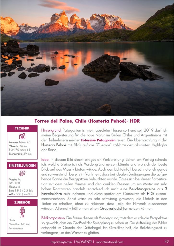 Bei jedem Bild findest du eine ausführliche Beschreibung der Location und der Situation vor Ort, wenn möglich mit Link zum passenden Beitrag auf meinem Blog. Ergänzt wird diese mit detailierten Infos zur grundlegenden Fotoidee, den gewählten Einstellungen und der Bildkomposition. Teilweise erkläre ich auch, was ich besser oder anders machen würde, wenn ich die Chance hätte das Foto erneut aufzunehmen.