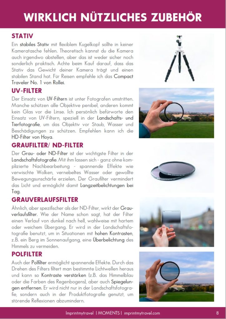„MOMENTS“ ist eine Sammlung von 100 unvergesslichen Fotomomenten und liefert gleichzeitig 100 praktische Lösungen, um diese Momente einzufangen. Dazu gibt es erprobte Tipps für bessere Reisefotos, eine Liste von wirklich nützlichem Zubehör in der Reisefotografie und ein umfassendes Fotografie-Glossar mit mehr als 100 Fachbegriffen.